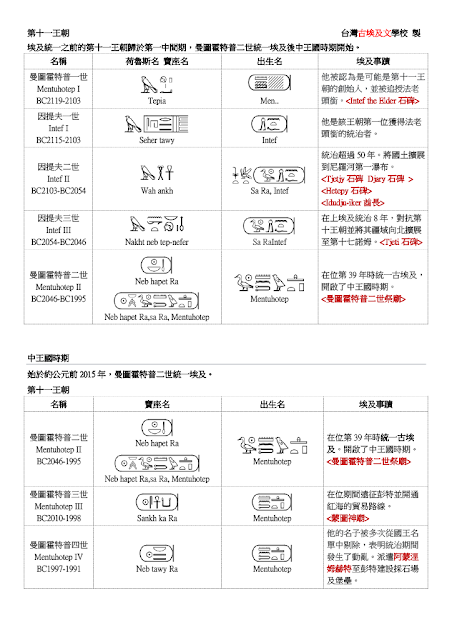 本校所使用的法老列表教科書,彙整了所有法老名稱、年代、王名框、